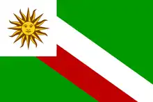 Flag used by Uruguayan ruralists, based on the national flag of Uruguay. The green background represents the countryside, while the white and red lines are a symbol of the Blanco and Colorado parties.