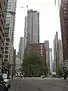 Rush Street is known for hosting some of the few highly rated and esteemed restaurants in the Chicago Gold Coast neighborhood.[36] According to Frommer's and Zagat Survey, Gibsons Steakhouse is one of the favorite restaurants in Chicago,[38][39] and is located on Rush Street. Rush Street is a block east of the original location of the Chicago-style deep dish pizza, Uno Chicago Grill,[40] and it hosts Giordano's, its answer to Uno's. Among the most prominent businesses along this strip is the Bentley and Lamborghini Gold Coast showroom,[35] which is located across East Pearson Street from The Clare at Water Tower along Rush Street. The Clare is one of the tallest residential buildings reserved for seniors anywhere in the world.[41] Rush Street's southern terminus is adjacent to a rear entrance of the Wrigley Building as well as the Trump International Hotel and Tower which has a 401-North Wabash address.[42] The 800 block of the Gold Coast neighborhood portion of Rush Street is a block away from Michigan Avenue and four of the tallest buildings in the world: John Hancock Center (875 North Michigan Avenue), 900 North Michigan, Water Tower Place (845 Michigan), & Park Tower (800 Michigan). Four more of the fifty tallest buildings in Chicago are also a block from Rush Street: Olympia Centre (737 Michigan), One Magnificent Mile, (980 Michigan), Chicago Place (700 Michigan), and Palmolive Building, (919 Michigan). 55 East Erie Street, which was the second tallest all-residential building in the world from 2004 until 2007 when 340 on the Park was completed,[43] is among the skyscrapers on or with entrances on Rush street. There is a current proposal to redevelop 740 North Rush Street (at the corner of East Superior Street) with a fifty-story skyscraper designed by Skidmore, Owings & Merrill and developed by Fordham Company.[44] This address currently houses the Chicago offices of Crain Communications Inc., and it is just north of Giordano's, which has a 730 North Rush Street address.
