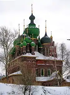 A cuboid, usually five-domed church with no piers and a pyramid of kokoshniki is connected by a covered gallery (refectory or vestibule) to a tent-like bell tower (the prow) over the western porch. | Moscow, from 1650s onward | ![]() | |
