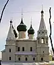 | Combinations of onion domes and tent-roofs | An archaizing four-piered church on an elevated base with five outsize onion domes is surrounded by an enclosed gallery leading to several chapels, porches, and belfries of various shapes and sizes. | Rostov, Abraham Bogoyavlensky cathedral 1550s, Yaroslavl and Upper Volga region, 1640s to 1680s |
