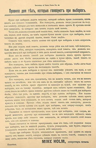Since 2012, New York State institutions provide free interpretations from/into Russian. Also, some state and elections documents are translated into it. [9]
