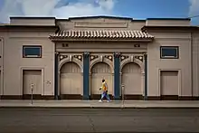 The Rustigian Building is a one-and-a-half story Classical Revival building with scored stucco siding, a flat roof with a parapet and simple cornice. An arcade is located at the center of the front façade with “J.M. Rustigian” inscribed above.[5] It was designed by the architecture firm of Schwartz & Rayland. Schwartz & Rayland were known for designing residential, commercial and school buildings throughout the Central Valley. They later expanded to the Bay Area and by the 1930s had established branch offices in Monterey and Salinas.