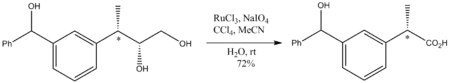 Because RuO4 degrades the "double bonds" of arenes (especially electron-rich ones) by dihydroxylation and cleavage of the C-C bond in a way few other reagents can, it is useful as a "deprotection" reagent for carboxylic acids that are masked as aryl groups (typically phenyl or p-methoxyphenyl). Because the fragments formed are themselves readily oxidizable by RuO4, a substantial fraction of the arene carbon atoms undergo exhaustive oxidation to form carbon dioxide. Consequently, multiple equivalents of the terminal oxidant (often in excess of 10 equivalents per aryl ring) are required to achieve complete conversion to the carboxylic acid, limiting the practicality of the transformation.[10][11][12]