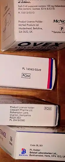 In the United Kingdom, the Medicines Act 1968 and the Prescription Only Medicines (Human Use) Order 1997 contain regulations that cover the supply of sale, use, prescribing and production of medicines. There are three categories of medicine:[4]