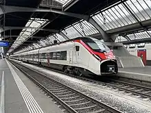 The low-floor entrances allow step-free access from platforms at heights between 550 mm (22 in) and 760 mm (30 in) and several accessible toilets and areas for wheelchairs are available, allowing the train to comply with the Law on Equal Rights for Persons with Disabilities.[21] As a long-distance train, it also features signal boosters for 3G/4G cellular phone networks, power sockets (for Swiss and international plugs) and large luggage racks for passenger comfort, along with energy-efficient lighting. The interior is flexible, meaning it can be extensively refitted and modified to an operator's requirements.[20]