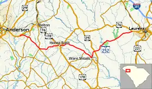 South Carolina Highway 252 (SC 252) is a 35.711-mile-long (57.471 km) state highway in the U.S. state of South Carolina. The highway connects the Anderson and Laurens areas with Honea Path and Ware Shoals. It has a unique feature in that it intersects U.S. Route 76 (US 76) three times along its length.