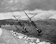 The crew attempted to drop the starboard anchor, but it did not catch in the stony ground. Gneisenau was driven into the mole repeatedly, striking it with her stern twice before being turned and pushed bow-first on the starboard side, forcing her aground. A merchant ship attempted to come to the crew's aid, but they were unable to connect a line between the two ships before Gneisenau began to list 35 degrees. A boat from shore also attempted to rescue the crew, but it too was forced ashore in the heavy seas. Wave action quickly smashed Gneisenau's hull against the mole, and part of her crew attempted to find safety by climbing the rigging. The ship rolled over onto her side, and the surviving crewmen reached shore with a line. Forty-one men were killed in the accident, including Kretschmann and the ship's first officer. Charlotte and the British ironclad HMS Devastation were sent to aid the wounded. Those killed in the sinking were buried in Málaga's cemetery, and the survivors returned to Germany aboard the HAPAG steamship SS Andalusia on 2 January 1901.[14]