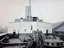 A powerful steam windlass was situated forward on the shelter deck for working the anchors, which were arranged to be stowed in hawse pipes, and two large capstans were fitted aft on the shelter deck for warping purposes.[4] A combined steam and hand steering engine was also located aft, and this was controlled by a telemotor gear from the navigating bridge.[4] There was also a powerful steering gear situated forward, the purpose of which was to operate a bow rudder so as to facilitate the quick turning and manoeuvring of the vessel when entering or leaving port.[4] For the stern rudder there was a combined steam and hand gear.
