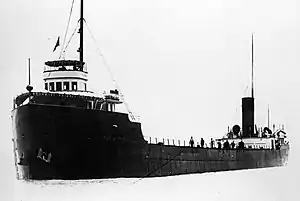 The majority of the passengers and crew climbed over to William Henry Mack, while three men and three women escaped using a lifeboat.[20][24] Seven minutes after the collision, John Mitchell capsized and sank.[20][24] The suction created by her sinking capsized the lifeboat.[20][24] Sixteen year-old passenger Fay Clemens, one of the six people in the overturned lifeboat was able to get William Henry Mack's crew to throw her a line, which she fastened to the overturned lifeboat, enabling two crew of William Henry Mack to right it.[18][20][24] As she was sinking, three crewmen, second officer Archie Causley, watchman George Austin and steward Albert "Al" Clemens, father of Fay Clemens jumped overboard to aid in the rescue, and were sucked under and drowned when John Mitchell sank.[18][20][24] William Henry Mack remained afloat, and headed for Sault Ste. Marie, Michigan.[18]