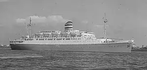 SS Ryndam was an ocean liner built for Holland America Line in 1951. She was built by N.V. Dok en Werfmaatschappij Wilton-Fijenoord, Schiedam. She was christened by Mrs. C. Tjarda van Stakenborgh Stachouwer-Marburg (wife of the prewar Governor-General of the Dutch East Indies).[2] The original intent of her design was to be designated as the freighter Dinteldyk (which was also designed to carry a small complement of passengers). A decision was made to have her redesigned as a liner in 1950, but she still retained the stout hull lines and sturdy machinery of a freighter.[1][2] The ship played a major role in post-war immigration from Europe making frequent voyages to New York City and the Pier 21 immigration facility in Halifax, Nova Scotia, Canada. In March 1962 Edward & Alex Van Halen, and their parents Jan & Eugenia Van Halen, immigrated to the US aboard the SS Ryndam.