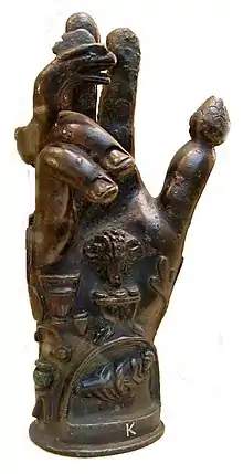 In Roman sites, though an inscription built into the wall of the abbey church of San Venanzio at Ceperana suggested to a Renaissance humanist[22] it had been built upon the foundations of a temple to Jupiter Sabazius, according to modern scholars not a single temple consecrated to Sabazius, the rider god of the open air, has been located.[19] Small votive hands, typically made of copper or bronze, are often associated with the cult of Sabazios. Many of these hands have a small perforation at the base which suggests they may have been attached to wooden poles and carried in processions. The symbolism of these objects is not well known.[19]