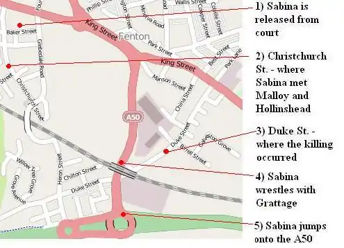 Leaving court, Sabina began to wander the streets of Stoke-on-Trent, trying to locate her sister in hospital, and carrying her possessions in a clear plastic bag given to her by police.[14] She was also wearing her sister's green top.[12] At 7:00 pm, two local men spotted Sabina while walking their dog on Christchurch Street, Fenton.[7][1] One of the men was 54-year-old Glenn Hollinshead, a self-employed welder, qualified paramedic, and former RAF airman,[15] and the other was his friend, Peter Molloy. Sabina appeared friendly and stroked the dog as the three struck up a conversation.[14] Although friendly, Sabina appeared to be behaving nervously, which worried Molloy.[14] Sabina asked the two men for directions to any nearby bed and breakfasts or hotels.[1]