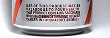 - USE OF THIS PRODUCT MAY BE HAZARDOUS TO YOUR HEALTH. THIS PRODUCT CONTAINS SACCHARIN WHICH HAS BEEN DETERMINED TO CAUSE CANCER IN LABORATORY ANIMALS.