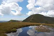 The top of Sail is a heathery dome bearing a small cairn. The main path along the ridge passes by to the south to take its heavily eroded course up Crag Hill. The view, other than where blocked by this lower neighbour, is excellent. The head of Coledale is laid out to the north while eastward is the full sweep of the Helvellyn range above Catbells. The High fells around Ennerdale, Wasdale and the head of Eskdale complete the panorama southward. Bassenthwaite Lake can be seen from the summit and a few steps will bring Buttermere and Derwentwater into view.[1]