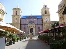 The cathedral's exterior is built in the Mannerist style typical of its architect Girolamo Cassar. Its façade is rather plain but well-proportioned, being bounded by two large bell towers.[5] The doorway is flanked by Doric columns supporting an open balcony from which the Grand Master used to address the people on important occasions.[11] On the side are also two empty niches.[17][18] The niches and the columns are a break with the rest of exterior Mannerist architecture.[19][18]