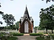 The second part of the historic district is part of the National Shrine of St. Elizabeth Ann Seton, which continues to be operated by the Daughters of Charity. The significant buildings here include the Stone House, which predates Mother Seton's arrival here, the White House, and Mother Seton's former tomb.[2] The White House is the first building constructed after the founding of the college and occupied on February 20, 1810.[7] It has subsequently been expanded. Mother Seton is now buried in the nearby basilica that bears her name, but she was previously buried in a brick Gothic Revival mausoleum in St. Joseph's cemetery. The Seton Shrine also includes the Basilica of the National Shrine of St. Elizabeth Ann Seton and the adjacent St. Joseph's Provincial House, but they are outside of boundaries of the historic district.
