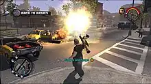 Players use hand-to-hand combat, melee weapons, firearms, and explosives to fight rival gangs and the police. A free aiming reticule appears on the screen while players have weapons equipped. Weapons are accessed by a "weapon wheel" inventory system that appears on the screen as players hold down a button. Each of the eight slots on the wheel corresponds to different types of weapons, such as submachine guns and pistols. Players may only carry one of each type of weapon at a time.[5] Saints Row makes use of regenerative health, but this process can be accelerated by eating fast food items.[3]
