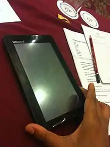 Aakash a.k.a. Ubislate 7+,[2] is a low-cost Android-based tablet computer promoted by the Government of India as part of an initiative to link 25,000 colleges and 400 universities in an e-learning program.[3] It was produced by the British-Canadian company DataWind,[4] and manufactured by the company, at a production center in Hyderabad.[5] The tablet was officially launched as the Aakash in New Delhi on 5 October 2011. The Indian Ministry of Human Resource Development announced an upgraded second-generation model called Aakash 2 in April 2012.[6]
