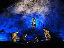The Salt Cathedral of Zipaquirá (Spanish: Catedral de Sal de Zipaquirá) is an underground Roman Catholic church built within the tunnels of a salt mine 200 metres (660 ft) underground in a halite mountain near the city of Zipaquirá, in Cundinamarca, Colombia. It is a tourist destination and place of pilgrimage in the country.[2] The temple at the bottom has three sections, representing the birth, life, and death of Jesus. The icons, ornaments and architectural details are hand carved in the halite rock. Some marble sculptures are included. The cathedral is considered one of the most notable achievements of Colombian architecture,[3] being described as a "Jewel of Modern Architecture".[4] The cathedral represents a valuable cultural, environmental and religious patrimony for the Colombian people.[5]