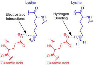 The salt bridge most often arises from the anionic carboxylate (RCOO−) of either aspartic acid or glutamic acid and the cationic ammonium (RNH3+) from lysine or the guanidinium (RNHC(NH2)2+) of arginine (Figure 2).[1] Although these are the most common, other residues with ionizable side chains such as histidine, tyrosine, and serine can also participate, depending on outside factors perturbing their pKa's. The distance between the residues participating in the salt bridge is also cited as being important. The distance required is less than 4 Å (400 pm). Amino acids greater than this distance apart do not qualify as forming a salt bridge.[11] Due to the numerous ionizable side chains of amino acids found throughout a protein, the pH at which a protein is placed is crucial to its stability.