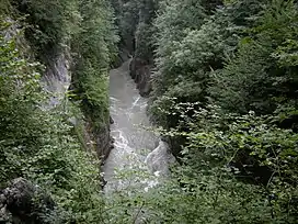 Salzachöfen, sometimes translated as Salzachöfen Gorge, is a narrow gorge in the Northern Limestone Alps of Salzburg State, Austria. The gap is formed by the Salzach river as it cuts between the Hagen Mountains and Tennen Mountains. Lueg Pass provides a route along the Salzach above Salzachöfen. The terms Lueg Pass and Salzachöfen are sometimes used interchangeably to refer to the whole canyon.