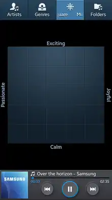 The S III can access and play traditional media formats such as music, movies, TV programs, audiobooks, and podcasts, and can sort its media library alphabetically by song title, artist, album, playlist, folder, and genre. One notable feature of the S III's music player is Music Square, which analyses a song's intensity and ranks the song by mood so that the user can play songs according to their current emotional state.[53] The device also introduced Music Hub, an online music store powered by 7digital with a catalogue of over 19 million songs.[93]