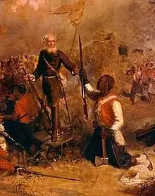 Hodge sustained serious gunshot wounds, but survived. British troops poured in through the now open gates; and in the fierce fighting that followed, several hundred of the Marabouts were killed, and the village and stockade burned down. Once the day had been won, D'Arcy presented Hodge to his regiment as the bravest man among them, to universal acclamation.[1]
