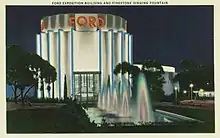 Entrance of the Ford Building with Firestone Singing Fountains, 1935.