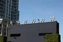 Prior to moving to Petco, the team played at Qualcomm Stadium, where the retired numbers were originally displayed on banners hanging from the light towers above the left field stands.[57][58] However, Garvey's number was commemorated instead on the wall behind the spot in right-center field where his winning home run in the 1984 NLCS cleared the fence, but the number disappeared when the stadium was expanded in 1997 and the location was masked by an overhang.[45][58][59] It reappeared in 2002 when all the retired numbers were moved and inscribed on the outfield fence.[58]