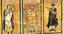 Contemporary depictions (and self-depiction) of three monks of Albelda, the scribes of the Codex Albeldensis, from left to right: Serracino, Vigila, and García (as drawn by Vigila)
