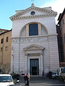 Records claim the church at the site was founded by the early 12th century, other records note founding by Pope Honorius III in 1216.[8] In 1418, the church was rebuilt by Alessandro Savelli, who had an adjacent palace. Some notes indicate it was linked to a group of English priests. By 1621, it was restored by the fathers of the Scuole Pie (Piarists) of St Giuseppe Calasanzio, who lived in the adjacent convent. His room is preserved. His relics are held in a porphyry urn under the main altar, while the chapel to St Pantaleo is now a side chapel. On the apse wall behind the main altar is a large marble bas relief depicting San Calasanzio presenting children to the Madonna and Child (1802) by Luigi Acquisti and commissioned by prince Giovanni Torlonia.[9] In 1808, also under the patronage of Prince Giovanni Torlonia, a neoclassical facade was commissioned from the architect Giuseppe Valadier.[10]