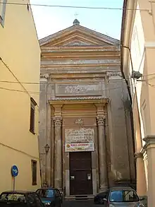 San Pietro is a Neoclassical-style, Roman Catholic church located in Nepi, province of Viterbo, region of Lazio, Italy. A church likely stood here by the 13th century. A new building was consecrated in 1465 and officiated by the Augustinian order. However in the 18th century, the town underwent a renewed urban plan, and the axis of the church was changed from East-West to North-South. Work on refurbishment began in 1755, and led to the present elliptical layout. The interior has a rich stucco decoration.[1]