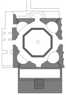 After the restorations of 1935-1938, it became clear that the four side niches, located at the diagonals of the building, were originally enriched by a jet of water falling into four fountains with mosaic floors.[58]