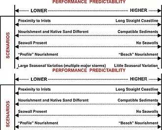 The performance of a beach nourishment project is most predictable for a long, straight shoreline without the complications of inlets or engineered structures. In addition, predictability is better for overall performance, e.g., average shoreline change, rather than shoreline change at a specific location.