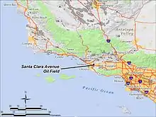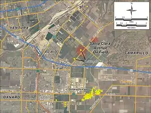 The Santa Clara Avenue Oil Field is an oil field in Ventura County, California, about six miles southeast of the city of Ventura and four miles northeast of Oxnard. It is produced entirely from two walled drilling islands along Santa Clara Avenue, each containing multiple directionally drilled wells. The field is within an agricultural area being encroached on several sides by urban development. As of 2010 the field reported 1,335,000 barrels of recoverable oil remaining, and had 18 active oil wells.[1]