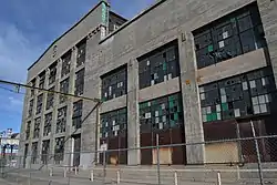 By far the largest building at the railyard is the erection and machine shop, which spans the full width of the site from Second to Commercial and contains about 165,000 square feet (15,300 m2) of floor space.[2] The building was designed in 1920 and built in eight months starting in February 1921. The erection shop and machine shop are within one building, separated by a wall on the south side of the erection shop. At the time it was considered to be at the forefront of industrial design, comparable to the Glass Plant at the Ford River Rouge Complex in Michigan.[1] The building has a steel structure, with uninterrupted glass curtain walls on the north and south faces and more substantial reinforced concrete facades on the east and west sides. The expansive main bay (erection shop) is 57 feet (17 m) high and 604 feet (184 m) long with several overhead cranes, the largest of which has a 250-ton capacity. The building is floored with wooden blocks to cut down on noise.