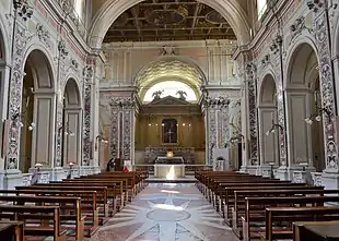 In an aedicule on the facade there was once a fresco of Madonna della Stella with Saints Gennaro and Francesco di Paola. The interior, after the fire in 1944, was redecorated with works of art from other churches. The main altar for example is derived from the church of San Sebastiano and canvases by Pietro del Po are from the Palatine Chapel of the Castel Nuovo (Birth of the Virgin, Presentation in the Temple and Flight to Egypt). At the end of the presbytery is an altarpiece by Battistello Caracciolo, depicting Immaculate Conception and Saints Domenic and Francis (1607), the only painting to survive the 1944 fire, since it was originally held in the sacristy. The sacristy is in rococo style, executed by Luca Vecchione (1740–1745). There is a bust of Luigi Riccio (died 1643), bishop of Vico Equense.[2]
