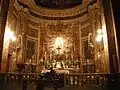The altarpiece of the Cornaro Chapel, the Ecstasy of St. Teresa, is among the most celebrated works of all of Baroque sculpture, and widely considered one of Bernini's masterpieces.[4] The statues depict a moment as described by Saint Teresa of Avila in her autobiography, where she had the vivid vision of a Seraph piercing her heart with a golden shaft, causing her both immense joy and pain. The flowing robes and contorted posture abandon classical restraint and repose to depict a more passionate, almost voluptuous trance. Although artistically a tour de force, nonetheless, during Bernini's lifetime and in the centuries following, the Ecstasy of St. Teresa has been accused of crossing a line of decency by sexualizing the visual depiction of the saint's experience, to a degree that no artist, before or after Bernini, dared to do: in depicting her at an impossibly young chronological age, as an idealized delicate beauty, in a semi-prostrate position with her mouth open and her legs splayed-apart, her wimple coming undone, with prominently displayed bare feet (Discalced Carmelites, for modesty, always wore sandals with heavy stockings) and with the seraph "undressing" her by (unnecessarily) parting her mantle to penetrate her heart with his arrow.[5][6]
