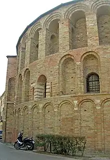 The early medieval apse, with a blind arches, a gallery, and a large central niche, was reconstructed in 1852. Some scholars have seen in part of a round unfinished, other similarities with the construction of Santa Maria and Donato in Murano.[1] The Romanesque bell tower Gothic, dated 1296, stands adjacent to the apse.[1]