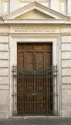 In 1587, when the church of Sts Sergius and Bacchus in the Roman Forum was suppressed as a cardinal deaconry, and the church demolished, it was succeeded by a renovated Sts Sergius and Bacchus in Monti. In 1622 it was entrusted by Pope Gregory XV (1621–23) to the Minim Friars of St. Francis of Paola who soon left it when they moved to another church near San Pietro in Vincoli.[4][6] The church was renovated under Pope Urban VIII (1623–44), through the patronage of his younger brother, Capuchin Cardinal Antonio Marcello Barberini (1569-1646, cardinal from 1624). [4] [6] Above the travertine doorway, the only part of the seventeenth century façade surviving today, is an inscription that records this work: