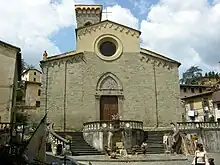 A church at the site dates from about the 11th century, but construction of the church continued until the 1300s. The scenographic, baroque entry stairs were built by Agostino Cornacchini. The main 13th-century portal, with a pointed tympanum above, was refurbished by Pietro Bernardini with flanking baroque-style corinthian pilasters. The bell-tower dates to the 13th-century.