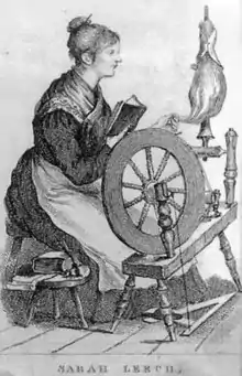 Leech was written about with great sympathy, focusing on how she was "the female orphan" in newspaper and commentary published about her, pieces about her detailed her piety and poverty. In the only collection of her poetry, Poems on various subjects published in 1828, her editor describes her life spent in "labour, indigence, and obscurity" and how any profits from the work would aid her in her "pilgrimage through life". Leech became lame, and appears to have been suffering from a condition like rheumatoid arthritis.[1] In 1826 she worried that she was losing her sight, and she was unable to continue to teach or supervise children.[2] Despite their poverty, the family appears to have retained some semblance of respectability. Leech is depicted in the frontispiece of Poems on various subjects with her spinning wheel, but she is well dressed. It is reported that Leech was deeply ashamed by how her life was described in lowly terms in the Londonderry Journal.[1]