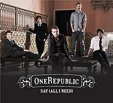 "Say (All I Need)" is a song by American pop rock band OneRepublic. It is the third single released from their debut album Dreaming Out Loud and follows the global success of their previous top ten singles, "Apologize" and "Stop and Stare". OneRepublic vocalist Ryan Tedder has commented that "Say (All I Need") is his "favorite track on the album."[1] All five members of the band Ryan Tedder, Zach Filkins, Drew Brown, Eddie Fisher and Brent Kutzle share writing and composing credits on the song.[2] The single was released in the UK on June 2, 2008 and features their Live Lounge cover of Duffy's single "Mercy".[3] The single was released on June 24, 2008 in the United States.
