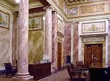 Scagliola (from the Italian scaglia, meaning "chips") is a type of fine plaster used in architecture and sculpture. The same term identifies the technique for producing columns, sculptures, and other architectural elements that resemble inlays in marble.[1] The scagliola technique came into fashion in 17th-century[2] Tuscany as an effective substitute for costly marble inlays, the pietra dura works created for the Medici family in Florence. The use of scagliola declined in the 20th century.[3]