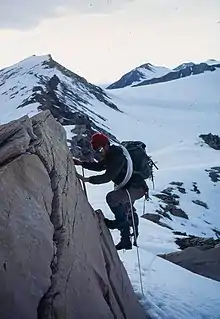 ![]() Expedition Photo August 1972, showing Kenneth Scaife climbing a rock-face | |