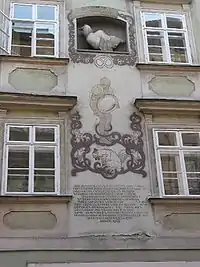 The house opposite the lantern, Schönlaterngasse 7, is home to a well-known Viennese myth. According to this myth, on 26 June 1212 in the morning, the servant of a baker discovered a basilisk at the bottom of the well in the courtyard. The baker’s apprentice noticed the creature and subsequently destroyed it by holding a mirror to it (looking into its eyes was known to be fatal). The basilisk exploded.[1] The facades of the house tell this tale, which was inscribed in its walls in 1932 using the original text from 1577.