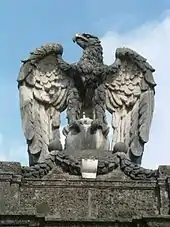 After the Austrian Anschluss in 1938, Adolf Hitler, when staying at his nearby Berghof residence, used Schloss Klessheim for conferences and to host official guests like Benito Mussolini, Miklós Horthy, Ion Antonescu, Jozef Tiso and Ante Pavelić. While Horthy stayed at Klessheim, Hitler on 19 March 1944 secretly gave orders[3] for Operation Margarethe to occupy Hungary and enforce the deportation of the Hungarian Jews to Auschwitz. On 7 July 1944, on the occasion of a weapons exhibition, an attempt by several Wehrmacht officers around von Stauffenberg to kill Hitler failed, when conspirator Helmuth Stieff did not trigger the bomb.[4] In May 1945 it was seized by the American military administration. Reichsadler statues made of limestone, that were attached to the entrance portals, were a reminder of the Nazi era.