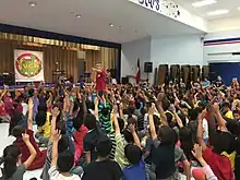 A school assembly is a gathering of all or part of a school for various purposes, such as special programs or communicating information.[1] In some schools, students may to perform a common song or prayer, receive announcements, or present awards. A routine attendance check may be done in such gatherings. At some schools, these meetings may be substituted by smaller classroom gatherings (sometimes called form or home room) and announcements broadcast over a public address system. Periodic school assemblies can be a forum for special presenters of educational, health, or safety materials, or for school plays, talent shows, etc.