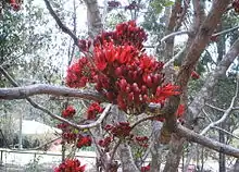 Inland it is usually deciduous, especially where the winter season is very dry or there is risk of frost. The tree gets its new leaves in spring, usually early to mid-September. The new leaves are a very showy bright red as with many savanna trees. The red foliage colour fades through bronze to dark green over a period of 7 to 10 days. The red flowers are produced straight after the new leaves during September and October and are very attractive to bees. They sometimes produce so much nectar that it drips from the flowers. The "weeping" label in some of its common names refers to the copious quantities of nectar that may rain from the flowers when shaken rather than a tendency of the foliage to "weep" or "droop".