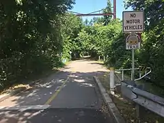 The trail continues southeastward, unpaved, along the former Manayunk Canal Towpath[10] of the Schuylkill Navigation System, passing through the neighborhood of Manayunk to the end of the towpath at Lock Street. Trail traffic is then directed onto the street or sidewalks of Main Street and Ridge Avenue toward Fairmount Park, where the trail meets the southern end of the Wissahickon Trail. Trail traffic continues on the road or sidewalk over the historic Ridge Avenue Bridge (NRHP) crossing the Wissahickon Creek, and turning right onto the paved multi-use trail beside Kelly Drive through east Fairmount Park.
